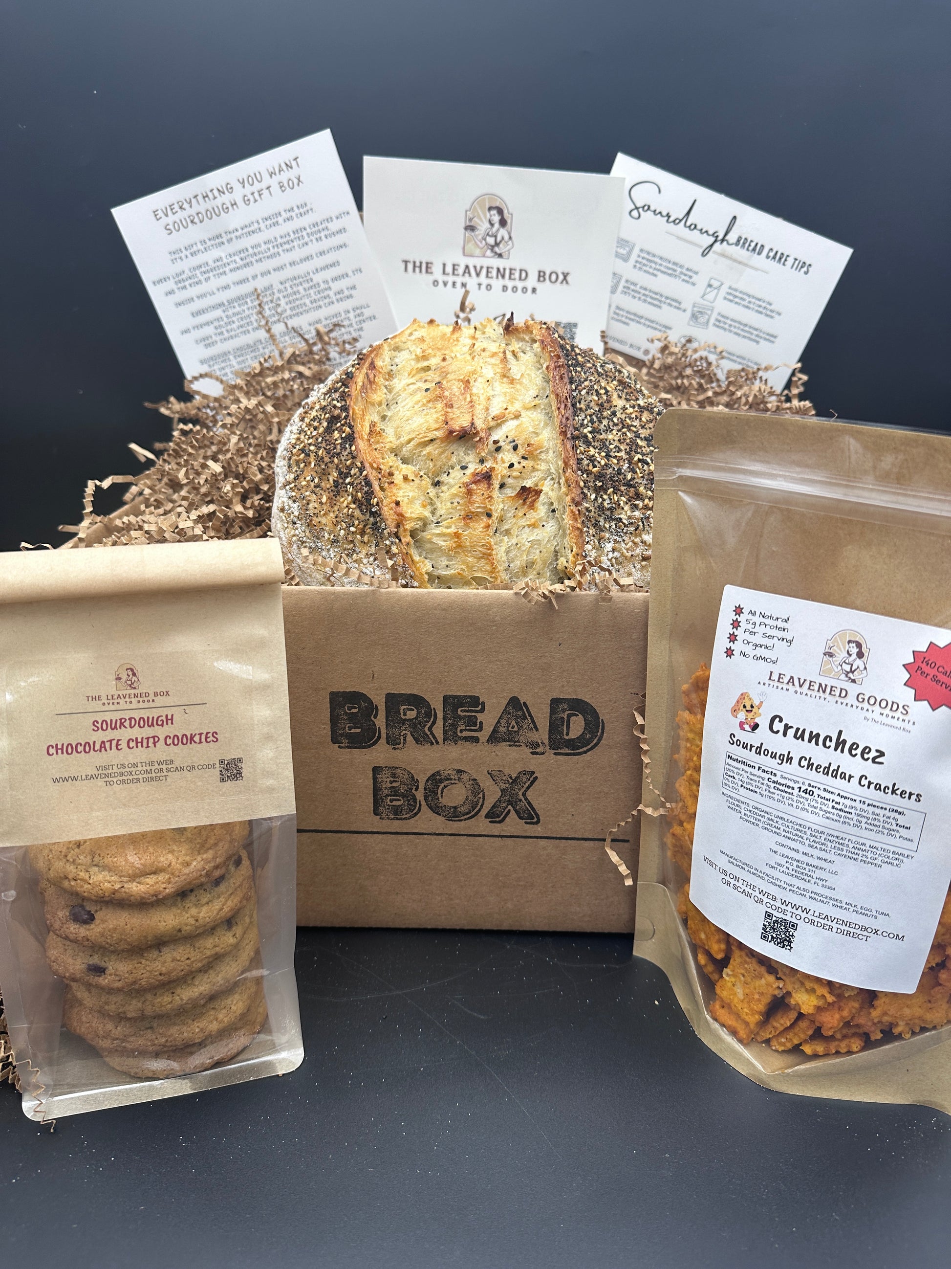 Everyone’s Favorite Gift Box brings together the best of The Leavened Box - the breads and bakes our customers can’t stop talking about. Inside, you’ll find a full-size Everything Sourdough Loaf, golden-crusted and bursting with the savory mix of sesame, poppy seeds, garlic, and onion you’d expect in an everything bagel - but reimagined in artisan sourdough form.Next, a full order of our beloved Sourdough Chocolate Chip Cookies - crunchy at the edges, soft in the middle, with the perfect balance of caramelized dough and rich chocolate. Finally, no box is complete without our artisan sourdough Cheddar Crackers. Choose from two favorites: Zesties: a bold kick of cayenne heat blended with real cheddar. Cruncheez: pure, cheesy satisfaction for those who love a classic cheddar bite. Every element is handcrafted in small batches, naturally leavened, and baked to order. Beautifully packaged, this gift box is meant for those moments when only the very best will do - to show clients, friends, or family just how much you care.