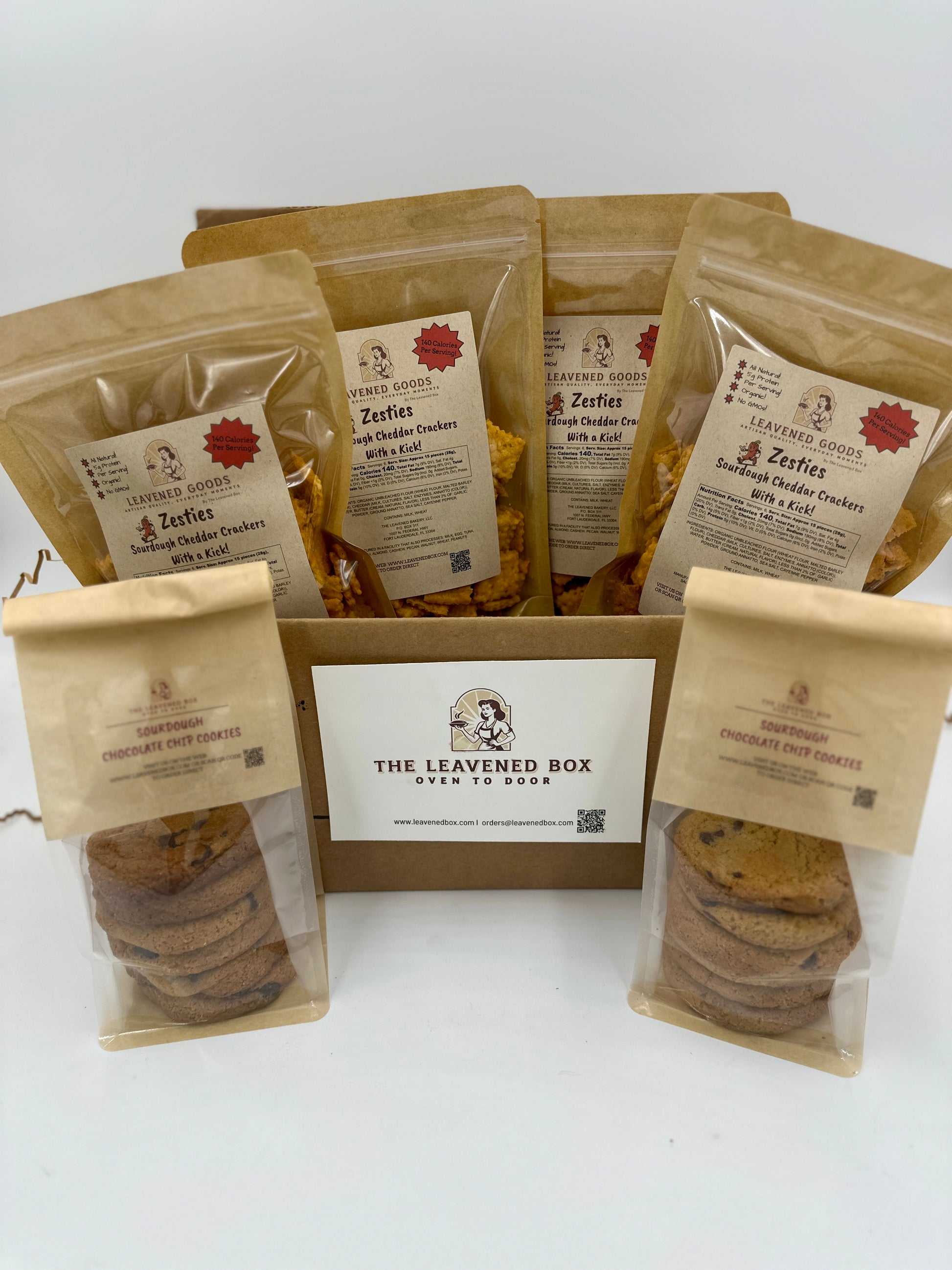 A ready-to-share mix of savory and sweet, designed for effortless hosting. The Crowd-Pleaser Bundle includes four bags of our Zesties Sourdough Cheddar Crackers paired with two bags of our soft, handcrafted sourdough chocolate chip cookies.