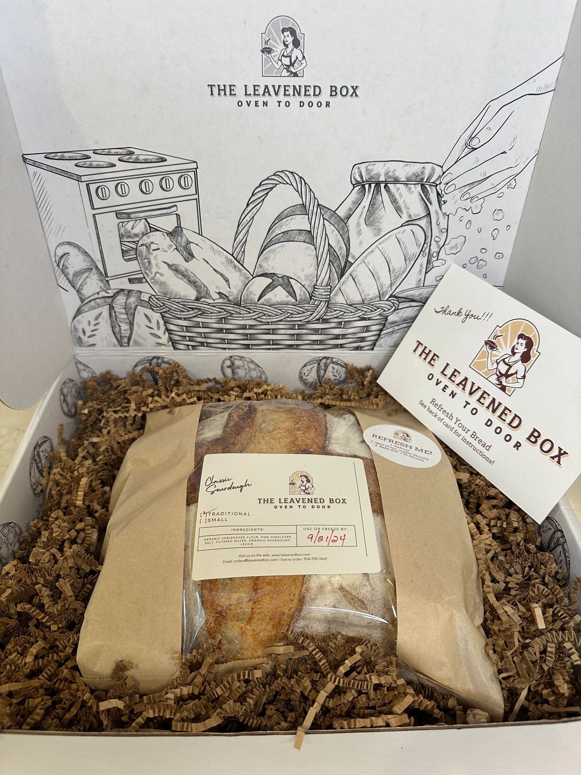 Nestled in a bed of colored crinkle paper (chose Kraft brown or pink), your loaves are wrapped and labeled with care, accompanied by our Sourdough Care Card, and space for your handwritten message. Whether you’re sending one or hundreds, this premium box ensures your gift arrives as a complete sensory experience—delightful to receive, delicious to enjoy.